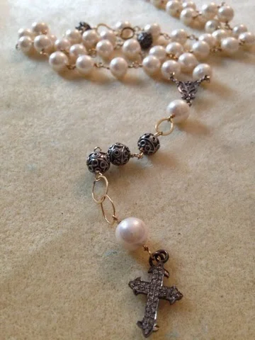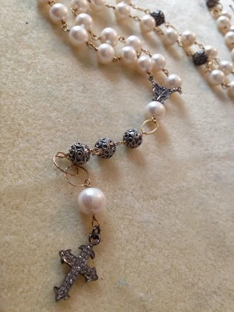 This one has real pearls, handmade Bali silver beads and a diamond cross.